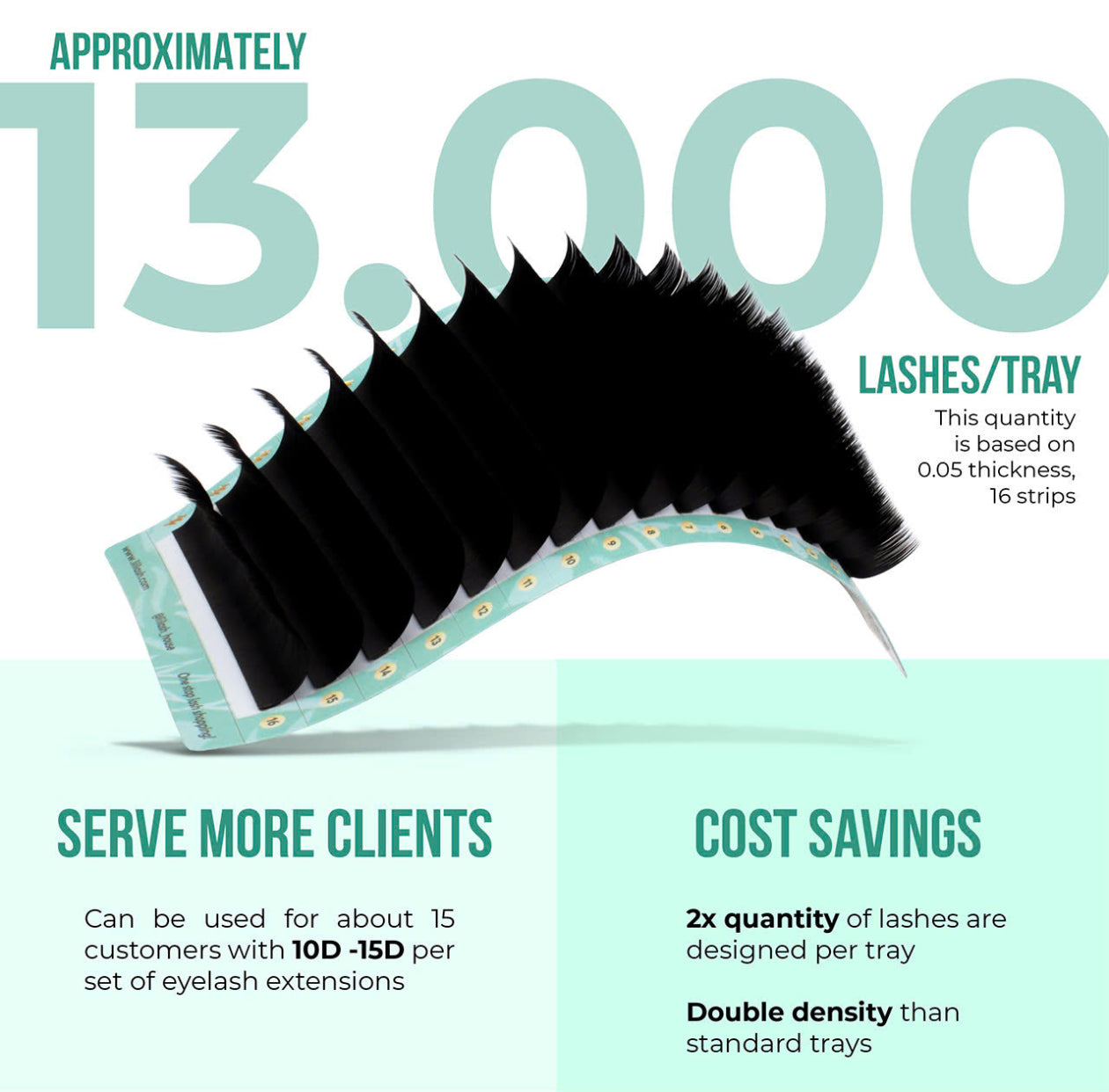 - Super dense with 13.000 lashes/tray